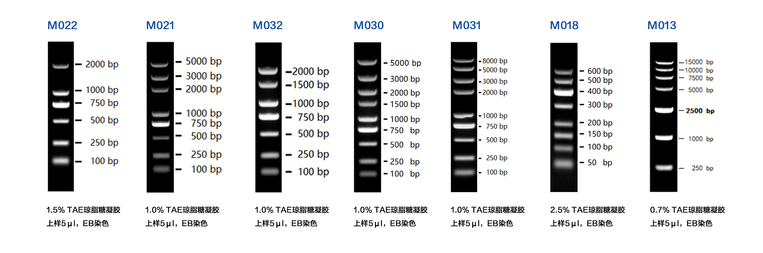 本產(chǎn)品為預(yù)混有 1× 上樣緩沖液的即用型 DNA 分子量標(biāo)準(zhǔn),由 7 條線狀雙鏈 DNA 條帶組成,適用于對(duì) 250-15000 bp 的雙鏈 DNA 分子大小的估算和粗略定量。本產(chǎn)品的 7 條帶分別為 250、1000、2500、5000、7500、10000 和 15000 bp。其中 2500 bp 條帶濃度最大,為 20 ng/µl,其余條帶濃度約為 10 ng/µl。