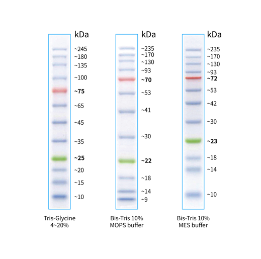 本產(chǎn)品由跨度從 10-245 kDa 的 12 種高度純化預(yù)染的重組蛋白質(zhì)組成,各條帶濃度約為 0.1-0.4 mg/ml。其中 25 kDa 條帶為綠色預(yù)染條帶,75 kDa 條帶為紅色預(yù)染條帶,方便判斷各個條帶的準確位置。本產(chǎn)品適合作為 SDS-PAGE 電泳時,變性蛋白樣品的分子量參照,并可實時觀察蛋白樣品的電泳分離狀況,也可用于檢測 Western blot 的轉(zhuǎn)膜效率。由于共價結(jié)合的染料會影響蛋白質(zhì)分子的電泳遷移率,本產(chǎn)品僅適于粗略地估計目的蛋白樣品的分子量。