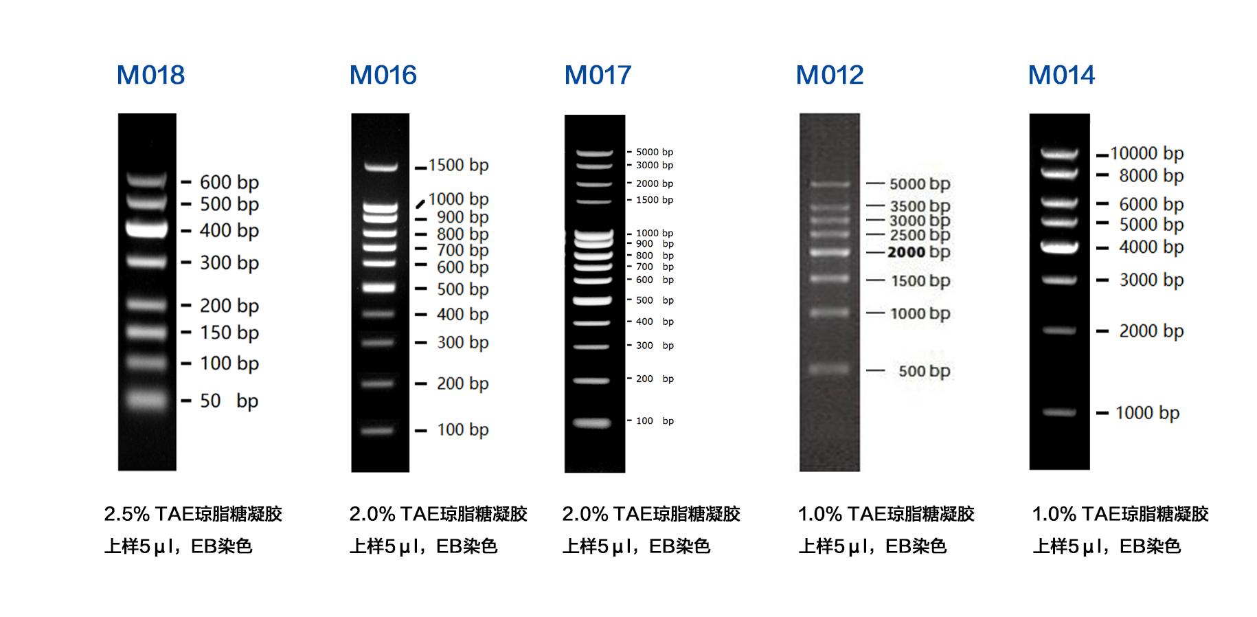 本產(chǎn)品為預混有 1x 上樣緩沖液的即用型 DNA 分子量標準,由 11 條線狀雙鏈 DNA 條帶組成,適用于對 100 bp 至 1 .5 kb 的雙鏈 DNA 分子大小的估算和粗略定量。本產(chǎn)品的 11 條帶分別為 100、200、300、400、500、600、700、800、900、1000 和 1500 bp,上樣 5 ul 時各條帶的 DNA 含量分別為 50 ng、40 ng、30 ng、40 ng、100 ng、60 ng、70 ng、80 ng、90 ng、100 ng、50 ng。
