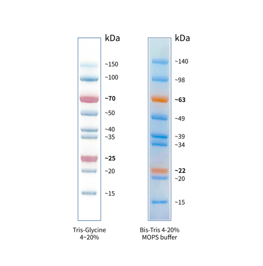本產品由跨度從 15-150 kDa 的 9 種高度純化的橙色、藍色預染蛋白質組成。其中 25 kDa 條帶和 70 kDa 條帶為橙紅色預染條帶。本產品適合作為 SDS-PAGE 電泳時,變性蛋白樣品的分子量參照,并可實時觀察蛋白樣品的電泳分離狀況,也可用于檢測 Western blot 的轉膜效率。由于共價結合的染料會影響蛋白質分子的電泳遷移率,本產品僅適于粗略地估計目的蛋白樣品的分子量。