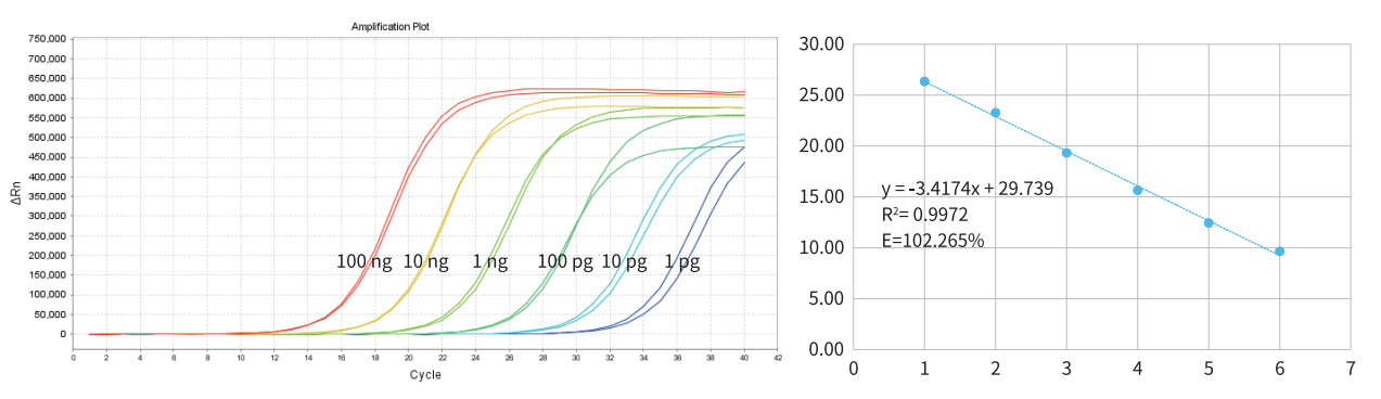 以 100 ng、10 ng、1ng、100pg、10pg、1pg 的小鼠 RNA 為模板,使用 A388 進行檢測。結(jié)果顯示,A388 的檢測下限可達 1 pg,且擴增效率高