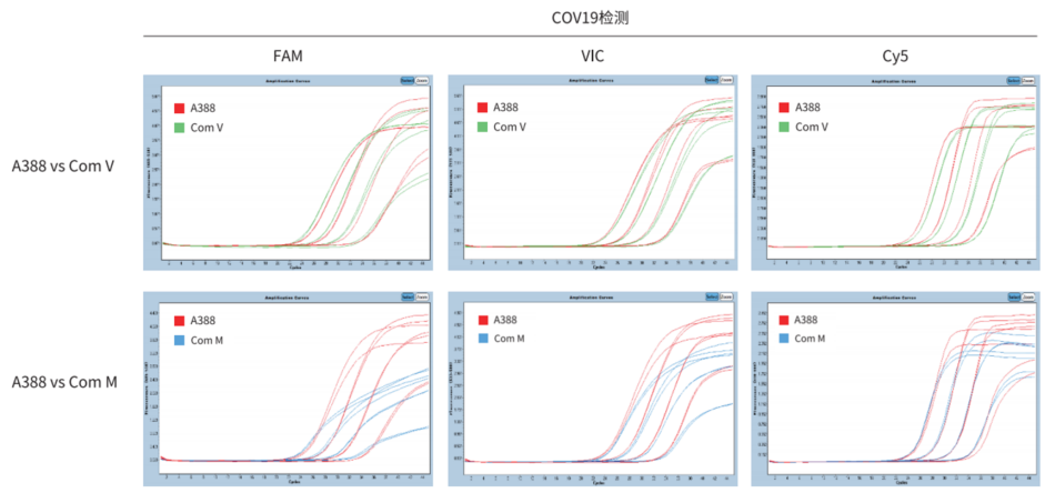 以不同濃度的 COV19 為模板,分別用 A388、 Com V 、Com M 進行檢測。結(jié)果顯示,A388 和 Com V、Com M 擴增效果相當,A388 擴增曲線和熒光強度優(yōu)于 Com M