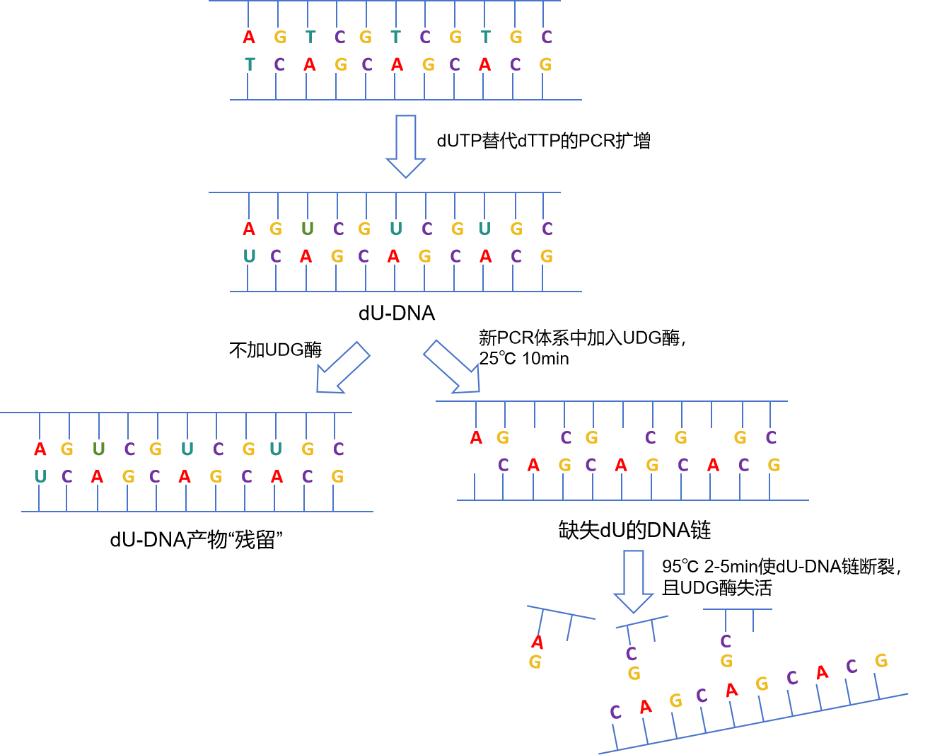 利用 UDG 酶選擇性水解含 dU 的 DNA 單鏈或 DNA 雙鏈的機(jī)制,巧妙地引入 dUTP 取代 PCR 體系中的 dTTP 而構(gòu)成了 dUTP/UDG 酶防污染系統(tǒng)。