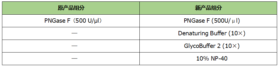 自 2024.08 起,G201 產(chǎn)品進(jìn)行了組分變更。變更后的產(chǎn)品提供肽 N-糖苷酶 F 適配的三種反應(yīng) buffer 即 Denaturing Buffer (10×)、GlycoBuffer 2 (10×)和 10% NP-40,使產(chǎn)品使用更加便捷。