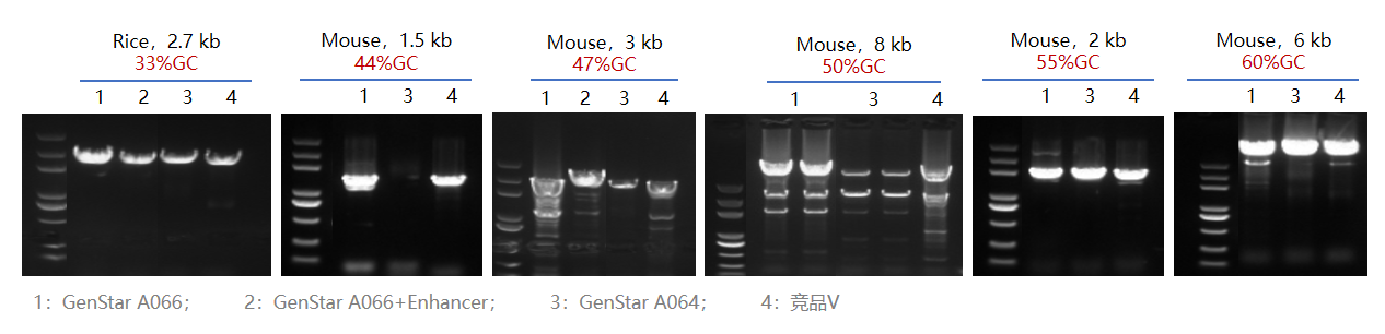 以 Mouse、Rice gDNA 為模板,使用 GenStar A066 和 GenStar A064、競品 V 分別擴增不同 GC 含量的目標片段。